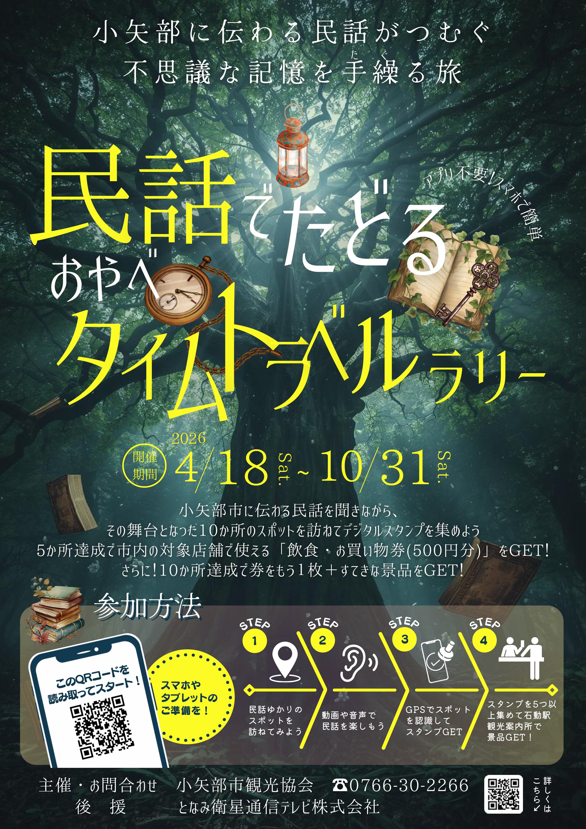 スマホで小矢部市に伝わる民話を聞きながら、その舞台となった場所を訪ねてデジタルスタンプを集めよう。5ヵ所以上集めて市内の対象店舗で使える「飲食・お買い物券(500円分)」や景品をGET!
