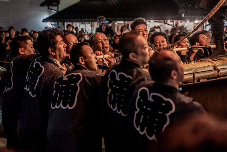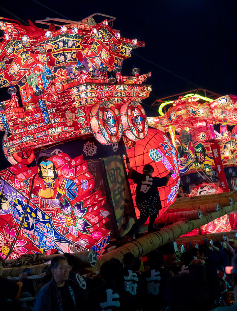 祭りの当日、宵闇が迫ると、家々の軒先毎につるした田楽行燈に灯がともされます。それを合図に、まず豆しぼりの鉢巻に小若の法被を着た子供たちが小行燈を引き、その後、若衆たちが太鼓の響きと掛け声とともに大行燈を練り担ぎます。祭りの見せ場は、向かい合った双方の大行燈が、総裁許(そうさいきょ)の掛け声で激しくぶつかり合い、相手側の吊り物を壊す「ぶつかり合い」。若衆たちの勇気、エネルギーのぶつかり合う瞬間であり、そこに居合わす見物客も一緒に緊張と陶酔の世界へと引き込んでいきます。
