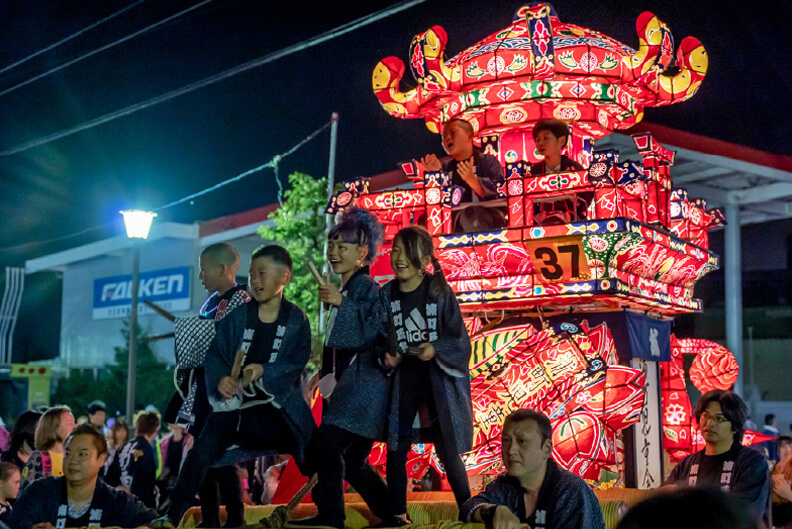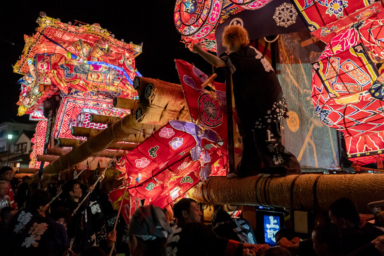 毎年6月第一金・土曜の夜、小矢部市津沢地区では五穀豊穣、天下泰平を願い津沢夜高あんどん祭が開催されます。夜高は田楽(でんがく)、山車、吊り物から組み立てられ、大きいものは高さ6m・長さ10m余りのものもあります。